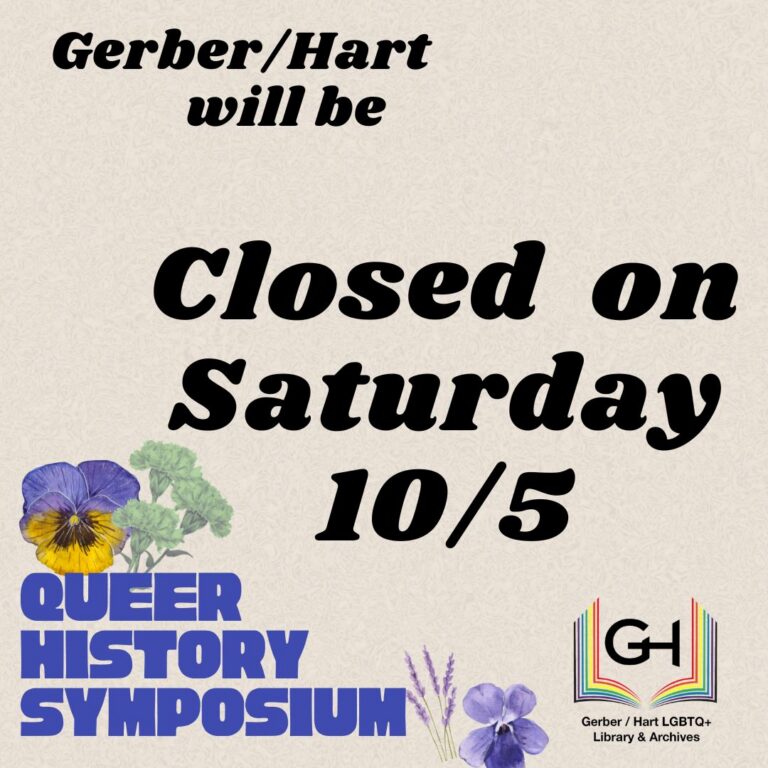 Gerber/Hart will be closed to the public on Saturday, October 5th, for our first Queer History Symposium. We will be open our usual hours on Wednesday (6-9 PM), Thursday (6-9 PM), and Friday (12-4 PM) but will be closed to…